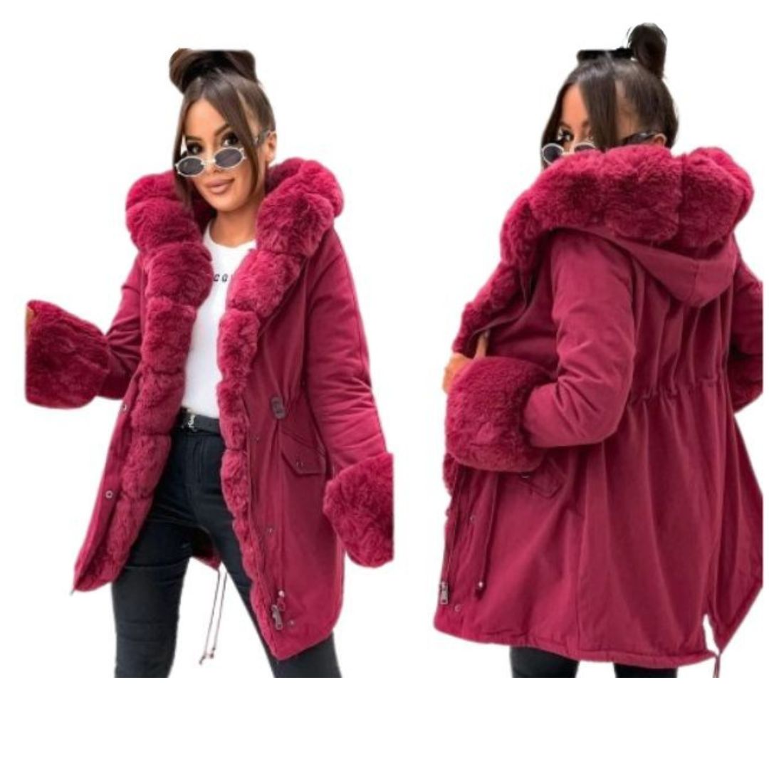 Warme, stijlvolle parka met bont in bordeaux kleur – perfect voor herfst en winter.