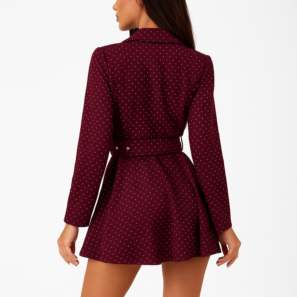 Stijlvolle bordeaux jumpsuit met riem, decoratieve gouden knopen en glinsterende steentjes.