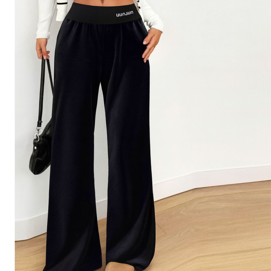 Stijlvolle zwarte fluwelen broek met een wijde pasvorm. Comfortabel en elegant – perfect voor dagelijks gebruik en voor de avond.