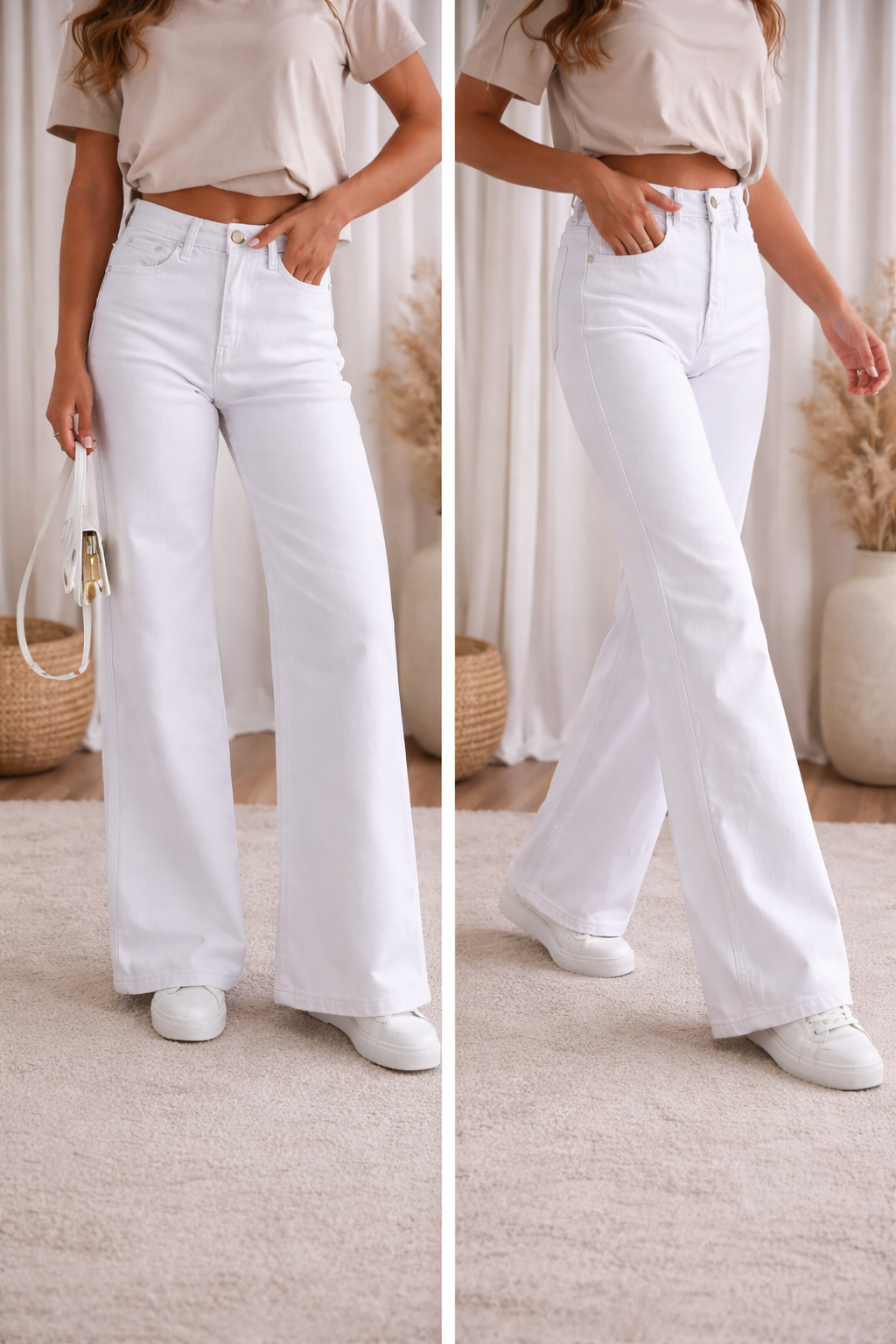 Białe jeansy – szeroka nogawka to ponadczasowy model z wysokim stanem, który pięknie podkreśla talię i zapewnia komfort noszenia. Idealne do codziennych i eleganckich stylizacji.