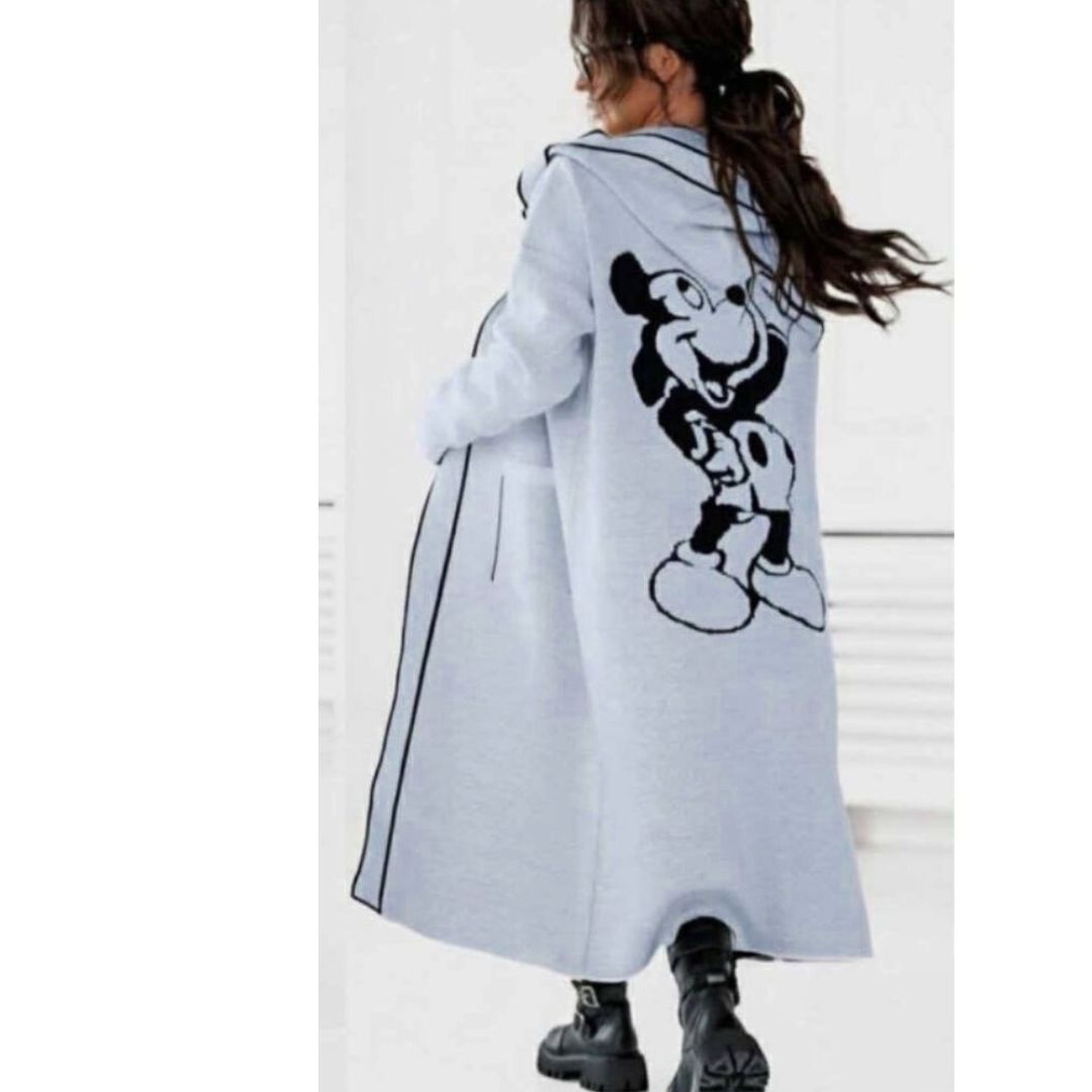 Długi niebieski kardigan z kapturem i nadrukiem na plecach. Miękki, wygodny i stylowy – idealny na chłodniejsze dni.